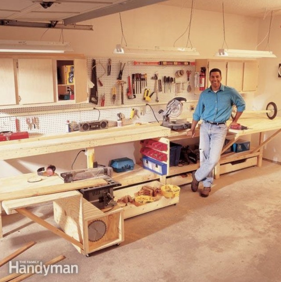 And I gotta tell ya, I’m having a blast with a garage again! Check out my workbench project. While our garage is a double, it’s not overly large at only 21 feet square. So, any workbench I’d build had to be very space conscious. But I also wanted a full-service workbench, including a miter saw, table saw, bench grinder, peg board and drawers for a TON of storage. I found a space-saving design in Family Handyman magazine that required only 24″ along one wall of my new garage. But it’s been an ambitious project, and now it’s almost done (whew).